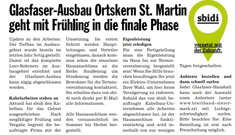 In unserer Gemeinde geht der Breitbandausbau in die nächste Runde. Nachdem in St.Ulrich im Greith das erste Ausbauprojekt mit der Breitband- und Digitalinfrastrukturgesellschaft (sbidi) erfolgreich umgesetzt wurde, gibt es grünes Licht für das nächste Projekt: St. Martin Nord.