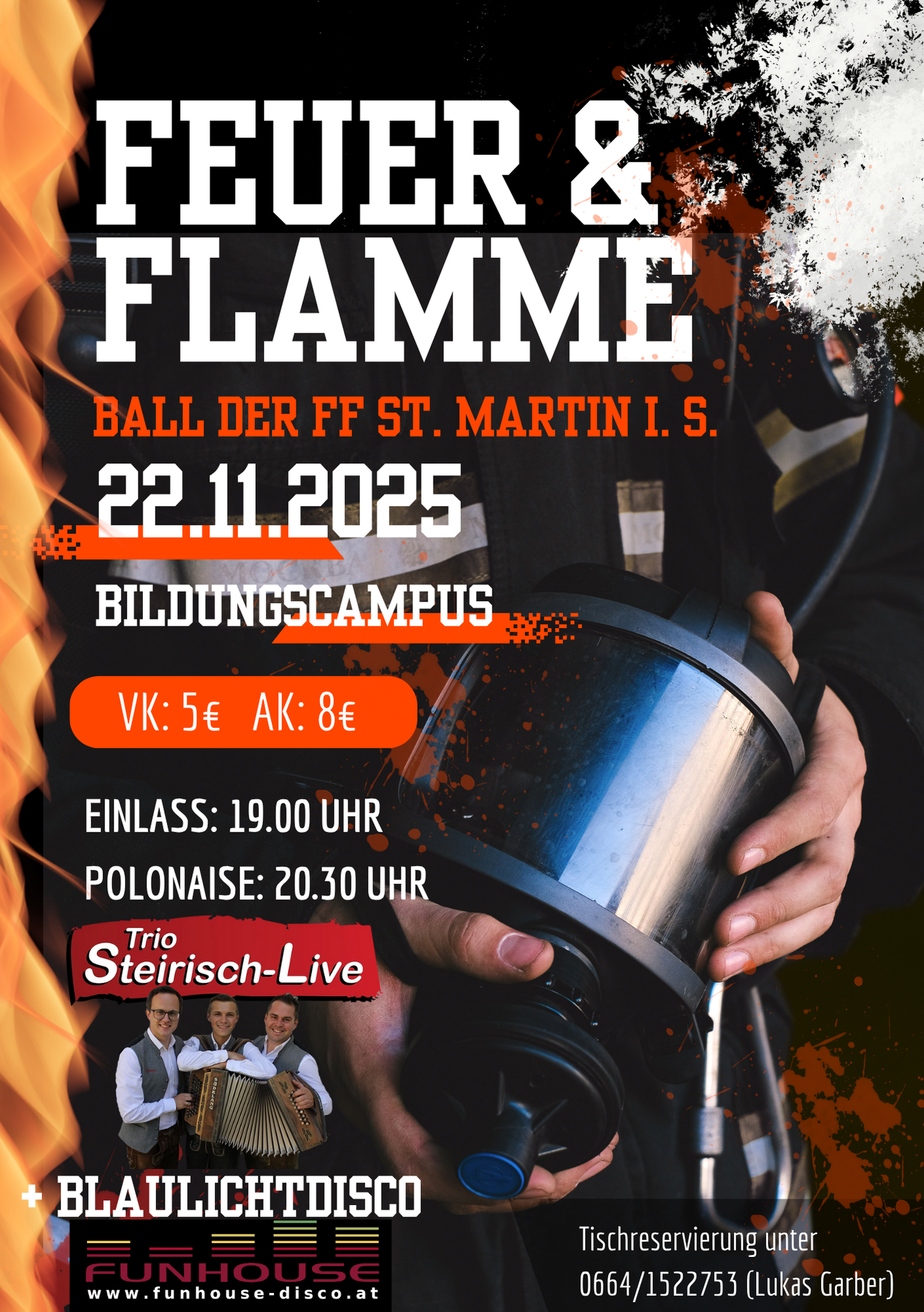 Die FF St. Martin im Sulmtal lädt zum Feuerwehrball „Feuer & Flamme“ ein und freut sich auf viele Besucher!