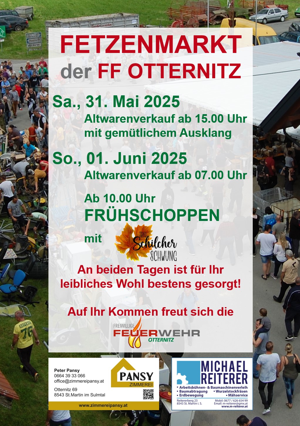 Fetzenmarkt der FF Otternitz Samstag, 31. Mai 2025: Altwarenverkauf ab 15:00 Uhr mit gemütlichem Ausklang Sonntag, 01. Juni 2025: Altwarenverkauf ab...