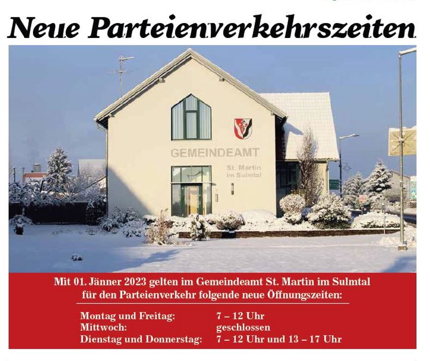 St. Martin im Sulmtal > Aktuelles  > ACHTUNG: neue Parteien-verkehrszeiten ab 01. Jänner 2023